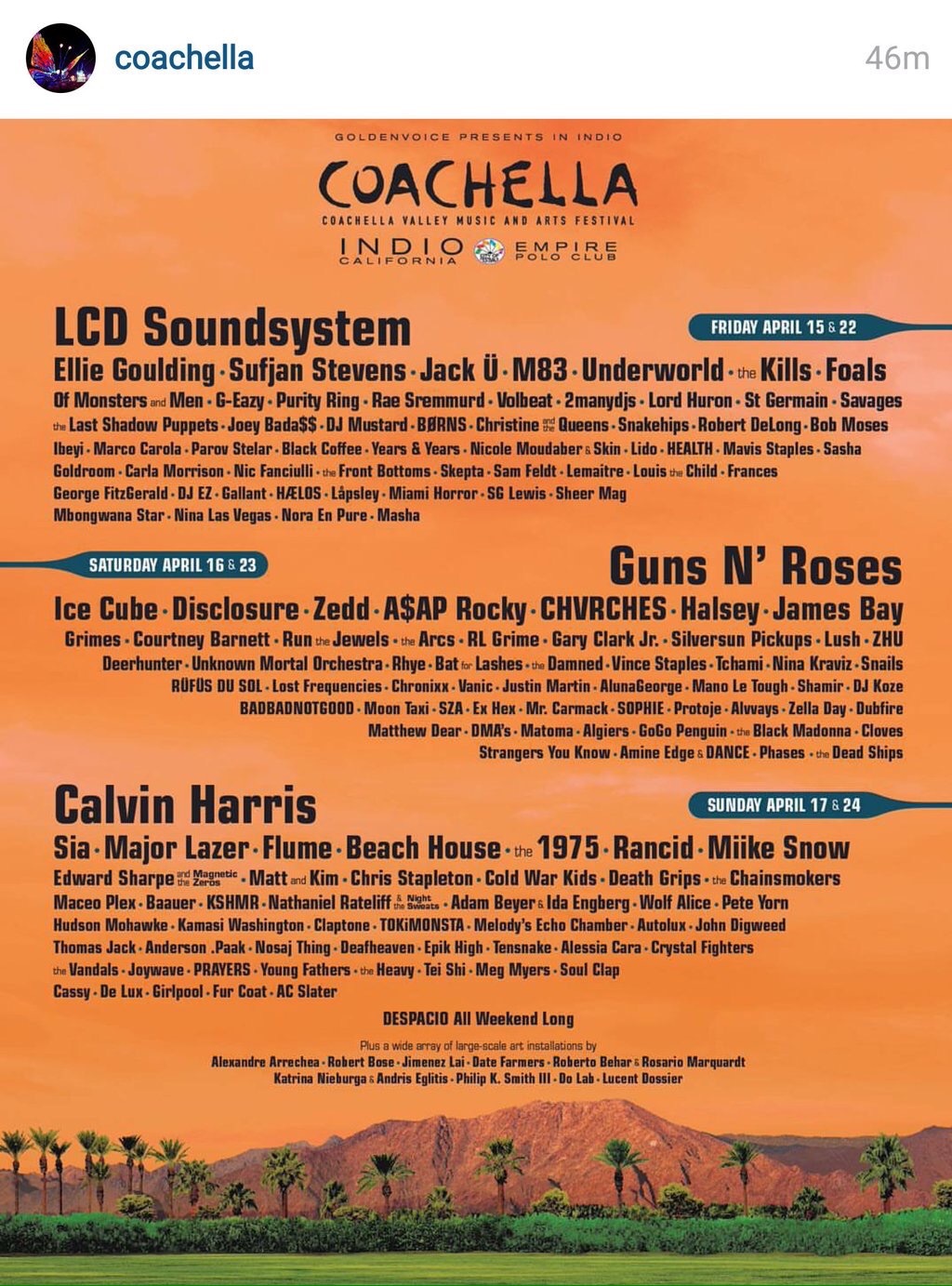 Going down for the typical 2 weekends in April, 15-17 & 24-26, Indio, CA will be lit up with people from all over the country- and world! Headliners in Guns N Roses, A$AP Rocky, Dosclosure, LCD, Ice Cub, Zedd, Ellie Goulding, Calvin Harris & more!