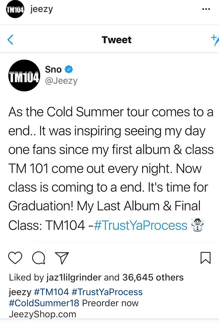 Jeezy took to his social media accounts to thank fans for a successful Cold Summer Tour and also announce his FINAL album, Thug Motivaton 104 (TM104). The album is already on preorder at JeezyShop.com.