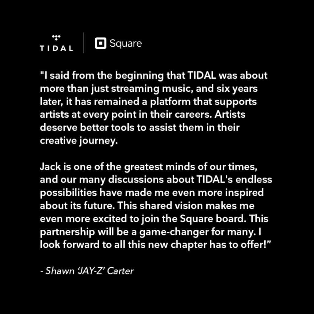 Now, what exactly does this mean for Tidal? Well, Jay-Z has always maintained that Tidal is a platform that will support artist throughout their careers and providing tools to help them sustain. Jack Dorsey is an innovator and this proves even more so.